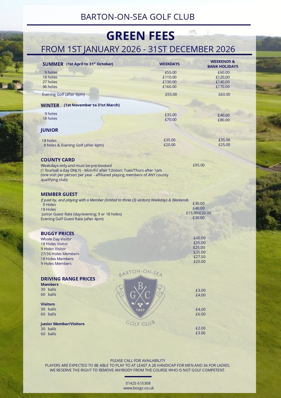 County Cards (1 fourball a day ONLY - Mon & Fri after 12noon; Tues & Thurs after 1pm; none on Wednesdays, Saturdays & Sundays) must be pre-booked with the Pro Shop 01425 615308 option 1.
